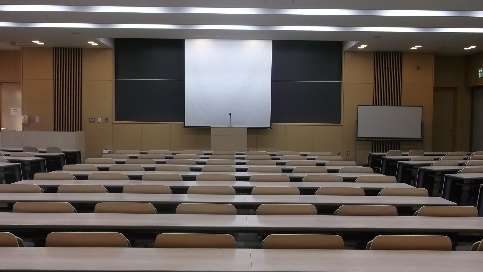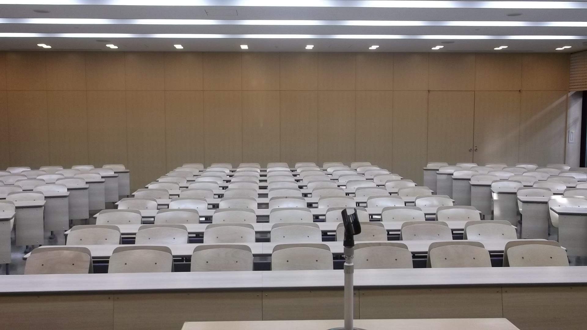 ・机椅子は固定式で289名収容(通路を挟み、後段7段に勾配があります)。