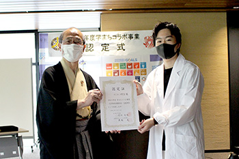 2021年7月12日(月)、京都市役所において令和3年度学まちコラボ事業の認定式が行われ、今年度採択された11団体に門川京都市長から認定証が交付されました。認定証を受け取った各団体の代表は、力強い決意表明を述べました。吹奏楽部の正装、いつも畑で履いている年季が入った長靴、科学教室の白衣など、自分たちの取組をアピールするユニークな服装で参加してくれた団体もあり、今後の期待がよりいっそう高まりました。
